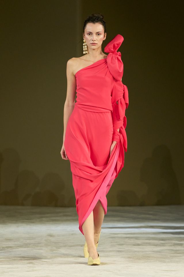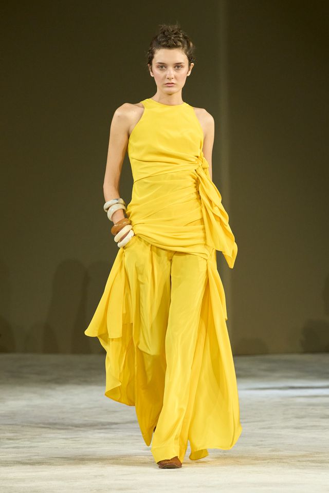 "La palette cromatica racconta un paesaggio dell’anima: butter, sky, dusty, coral cream, sand, ivory, natural, yellow white, blacke redsi rincorrono in una sinfonia materica di toni sussurrati e accenti vitali", spiega una nota della società. "Le silhouette si fanno mobili, scultoree ma intime: vestono non per definire ma per evocare".